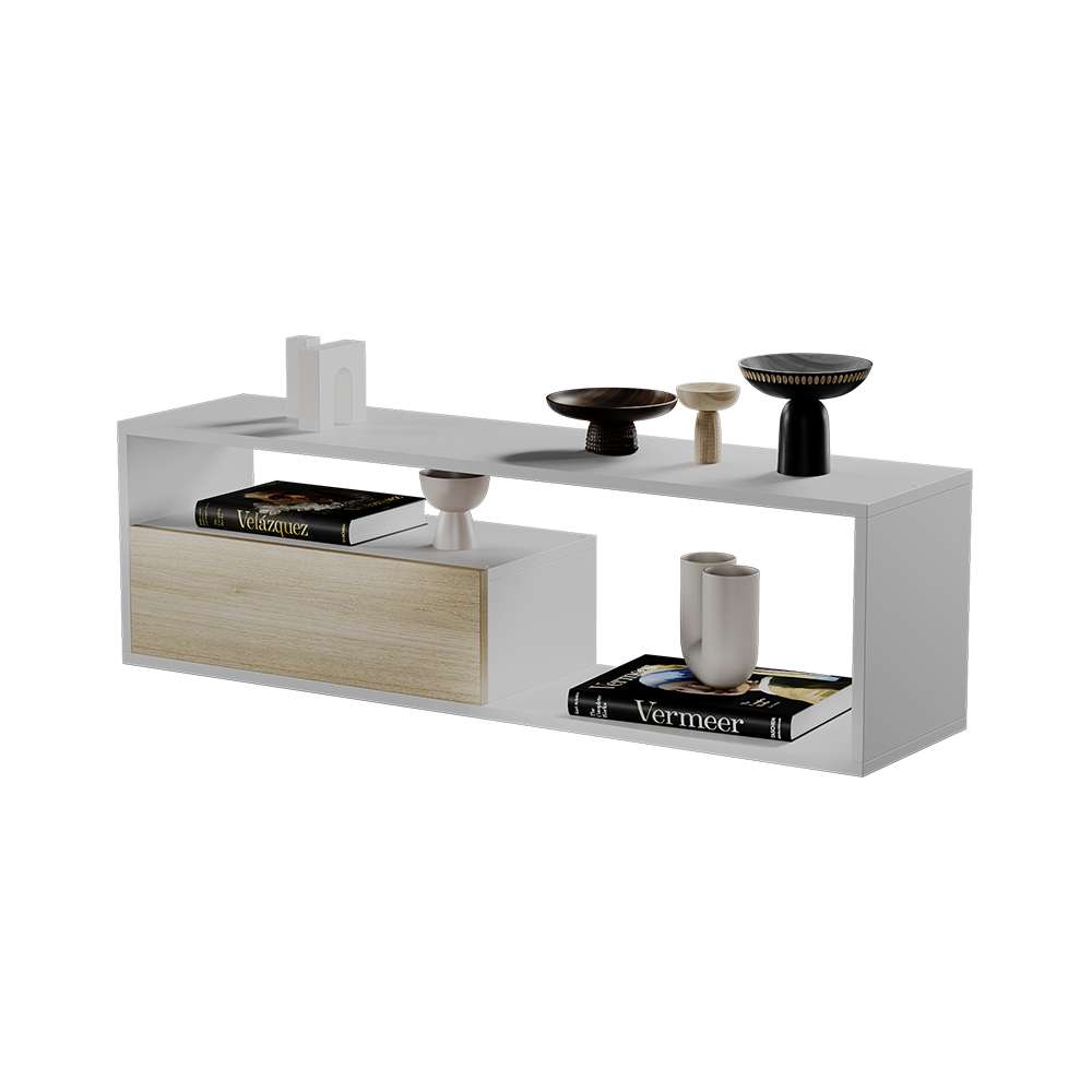 Possui compartimentos abertos para objetos decorativos e um compartimento fechado com porta, garantindo praticidade e discrição no armazenamento do dia a dia.